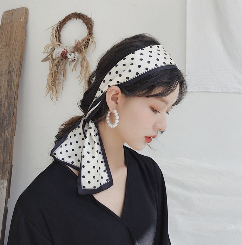 스카프를 머리에 묶는 방법도 있습니다. 복고풍 스타일 연출에 딱 좋은 방법입니다. 헤어스타일은 업스타일로 준비합니다. 스카프를 삼각형으로 접은 뒤, 느슨하게 굴려서 원하는 두께로 조절합니다. 스카프를 머리 뒤쪽에서 앞쪽으로 두른 뒤 머리 앞에서 매듭을 묶어줍니다. 리본으로 묶어도 좋습니다. 이렇게 연출하면 핀업걸 스타일을 완성할 수 있습니다.