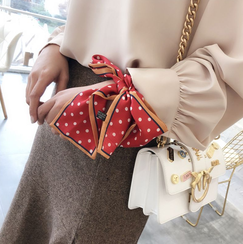 트렌드 하게 스카프를 연출하고 싶다면 손목에 묶는 방법이 포인트가 될 수 있습니다. 단조로운 단색 의상에 스카프로 포인트 컬러를 주는 방법입니다. 삼각형으로 접은 스카프를 원하는 너비로 접습니다. 손목에 두 번 이상 감은 뒤 짧게 매듭을 지어 고정합니다. 이때 매듭을 보이는 것이 좋을 때도 있고, 안으로 밀어 넣어 보이지 않게 하는 방법이 좋을 때도 있습니다. 자신의 취향에 따라 연출하면 되겠습니다.